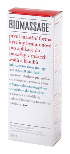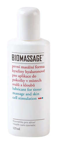 BIOMASSAGE je prvá masážna forma prírodného komplexu vysokomolekulárneho hyaluronanu na aplikácie do pokožky najmä v miestach svalov a kĺbov. Aplikuje sa pred, počas, aj po záťaži, alebo športových výkonoch. Účinná lubrikačná zložka je prirodzeným mazivom, telu vlastným. Udržuje pohybový aparát v dobrom stave, nemá žiadne známe vedľajšie negatívne účinky a je teda vhodná na denné použitie. Neobsahuje látky umelo tlmiace bolesť (analgetiká) a je úplne vstrebateľná.