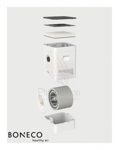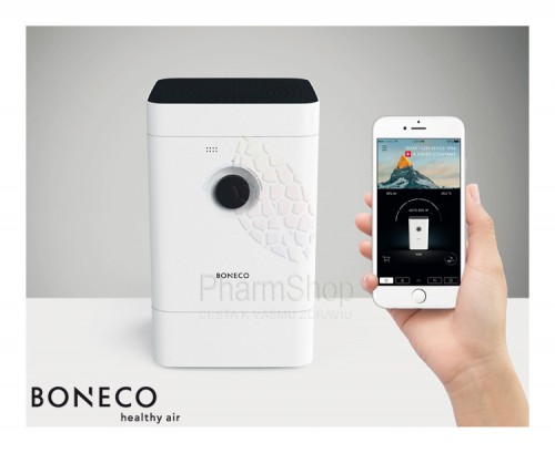 • Ďalšie funkcie dostupné pomocou aplikácie BONECO: preddefinované profily (AUTO, SLEEP, BABY) s optimálnou úrovňou relatívnej vlhkosti, zapnutie / vypnutie časovača, detská poistka, pripomienka na výmenu filtra