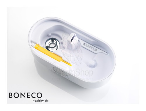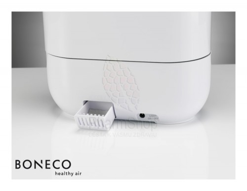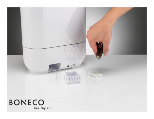 Nová ionizačná strieborná tyčinka A7017 (ISS) využíva antimikrobiálne účinky striebra a zabezpečuje optimálnu čistotu vody a likviduje baktérie, ktoré by mohli spôsobovať zápach vody. ISS pracuje aj pri vypnutom zvlhčovači. Ergonomický dizajn umožňuje ľahké čistenie. Ultrazvukový zvlhčovač je určený iba na prevádzku s neupravenou pitnou, nie príliš tvrdou vodou. Na čistenie a odstránenie minerálnych usadenín používajte raz mesačne prípravok Boneco CalcOff A7417.