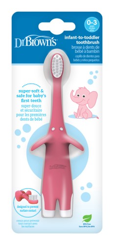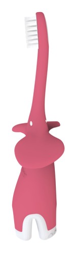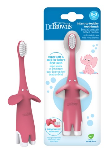 Veľmi jemná a bezpečná kefka pre prvé zúbky. Pružné telo je jemné na citlivé ďasná. Komfortná rúčka vhodná pre detský úchyt. Uši sloníka zabraňujú kontaktu kefky s povrchom pri položení. Dr.Brown´s zubná kefka pre batoľatá a deti pomáha zaviesť správne návyky pri ústnej hygiene.