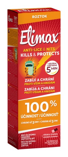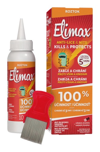Účinný roztok Elimax zabíja vši a hnidy a zároveň odpudzuje nové vši, čím chráni vlasy pred opätovným zavšivením už pri 1 ošetrení.