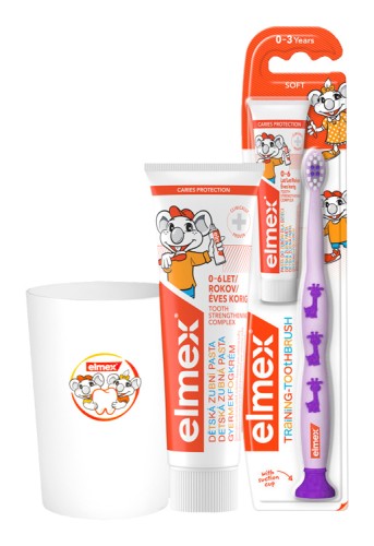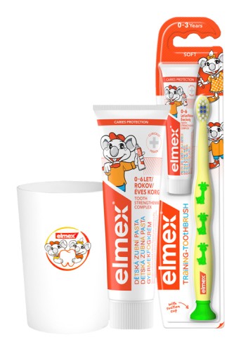 Odporúčané od prvých zúbkov do šiestich rokov. Odporúča sa používať v kombinácii s elmex® výučbovou zubnou kefkou (0-3 roky) alebo s elmex® detskou zubnou kefkou (3-6 rokov)