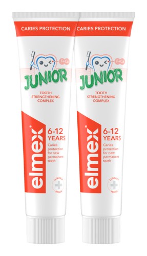 Odporúčané pre deti od šesť do dvanásť rokov. Odporúča sa používať v kombinácii s elmex® Junior zubnou kefkou (vlákna v tvare X) a s ústnou vodou elmex® CARIES PROTECTION JUNIOR.