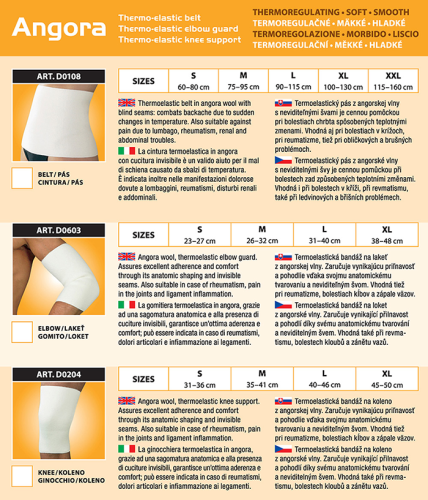 Termoelastická bandáž na koleno z angorskej vlny. Zaručuje vynikajúcu priľnavosť a pohodlie vďaka svojmu anatomickému tvarovaniu a neviditeľným švom. Vhodná tiež pri reumatizme, bolestiach kĺbov a zápale väzov.