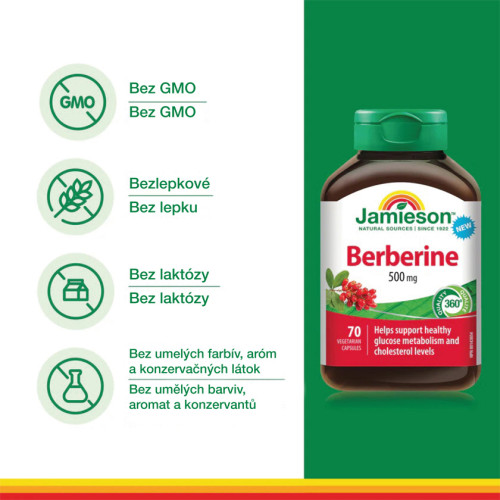 Berberín je prírodný alkaloid s výraznými liečivými účinkami, najčastejšie využívaný na stabilizáciu hladiny cukru v krvi (pri cukrovke 2. typu), zníženie cholesterolu a zlepšenie zdravia čriev. Má silné protizápalové, antimikrobiálne a antioxidačné vlastnosti. V tradičnej čínskej medicíne sa využíva už viac ako 400 rokov, najmä na podporu trávenia a často sa hovorí aj o jeho vplyve na chudnutie. Často sa môžete stretnúť aj s označením berberín hydrochlorid (HCl). Ide o hydrochloridovú soľ berberínu, ktorá vzniká spojením berberínu s kyselinou chlorovodíkovou. Tento proces zlepšuje stabilitu, rozpustnosť a schopnosť vstrebávania tejto látky v ľudskom tele. Vďaka tomu sa forma berberín HCl považuje za najvhodnejšiu a najúčinnejšiu na perorálne (ústne) užívanie a nájdete ju aj v produkte Jamieson Berberín 500 mg.