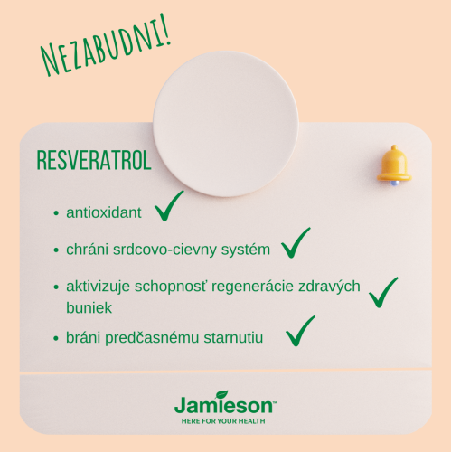 Extrakt z hroznových jadierok antioxidant z červeného vína – podpora pre srdcovo-cievny systém. Unikátne zloženie eliminuje agresívne účinky voľných radikálov, čím pôsobí proti starnutiu organizmu. Obsahuje ingrediencie prírodného pôvodu: resveratrol a jadierka z hrozna. V 1 kapsule sú obsiahnuté prírodné látky, ktoré sa rovnajú objemu približne šesť pohárov červeného vína, avšak bez kalórií a alkoholu. Jamieson Resveratrol extrakt z červeného vína s hroznovými zrniečkami obsahuje Resveravine® získaný z francúzskeho hrozna.