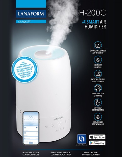 Zvlhčovač vzduchu je možné ovládať aj prostredníctvom aplikácie Lanaform Connect. Aplikácia, ktorú si možno jednoducho stiahnuť a používať, má vizuálne rozhranie na monitorovanie a kontrolu kvality vzduchu odkiaľkoľvek na svete.
