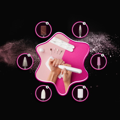 Nail Pen sa prispôsobí vašim potrebám vďaka 6 multifunkčným nástavcom. Čistite, pilujte, leštite, odstraňujte kožtičku alebo dodávajte lesk. Valcovitý nástavec ľahko odstraňuje mozole na rukách a nohách.