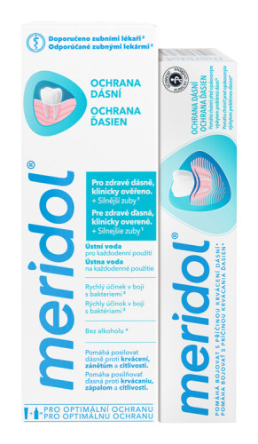Ústna voda bez alkoholu podporuje regeneráciu podráždených ďasien. Obsahuje aktívne zložky (amín a zinok), ktoré na dlhší čas inaktivujú zvyšky bakteriálneho zubného povlaku a zabraňuje jeho usádzaniu aj na miestach ťažko dostupných pre zubnú kefku. Ústna voda meridol je vhodná na každodenné používanie, najmä pri problémoch s ďasnami, v prípadoch obmedzených možností vykonávania ústnej hygieny a v pre pacientov s výraznou tvorbou zubného povlaku. Podporuje zdravú ústnu mikroflóru a je určená na dlhodobé používanie.
