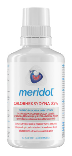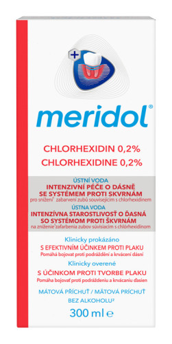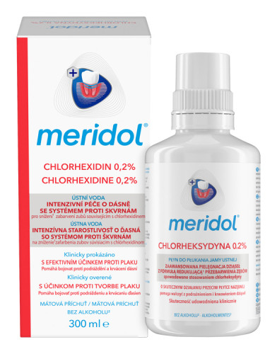 Ústna voda Meridol s Chlórhexidínom 0,2%. redukuje zubný povlak a pomáha pri predchádzaní problémov s ďasnami, ako sú podráždené ďasná či krvácanie z ďasien.
