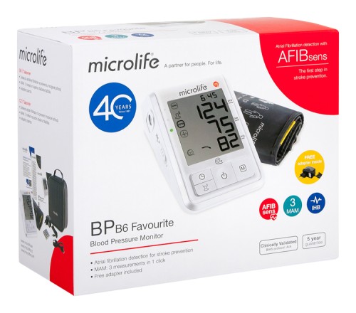 BP B6 Favourite je prémiový tlakomer pre vaše zdravie. Deteguje atriálnu (predsieňovú) fibriláciu s vysokou presnosťou a po každom meraní zobrazuje porovnanie aktuálneho merania s priemerom predchádzajúcich meraní tlaku krvi. Detailný popis