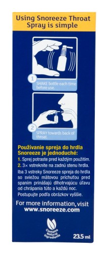 Iba pre perorálne používanie jedinou osobou. Uchovávajte mimo dosahu malých detí. Pumpa spreja obsahuje malé súčiastky. Odporúčame konzultáciu s lekárom pred použitím tohto spreja, ak ste tehotná alebo dojčíte. Snoreeze sprej do hrdla nie je určený na liečbu spánkovej apnoe. Pokiaľ máte podozrenie, že trpíte týmto zdravotným problémom, poraďte sa s lekárom. Akýkoľvek závažný nežiaduci účinok, ktorý sa objaví pri používaní tohto spreja treba nahlásiť jeho výrobcovi a na Štátny ústav pre kontrolu liečiv.